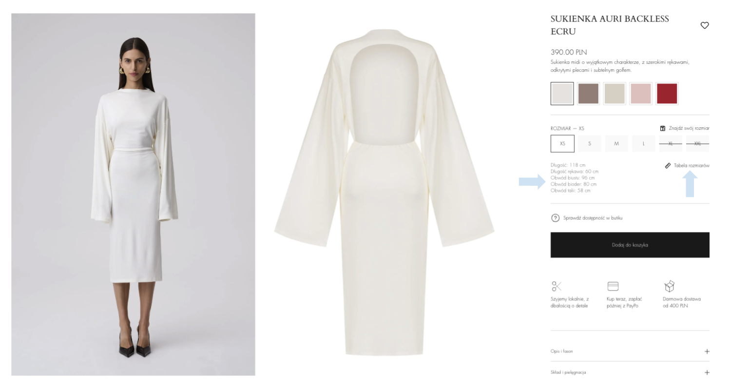 W przypadku sukienek, spódnic czy spodni – mierz pionowo od najwyższego punktu (np. ramienia, talii) aż po dolny brzeg ubrania.